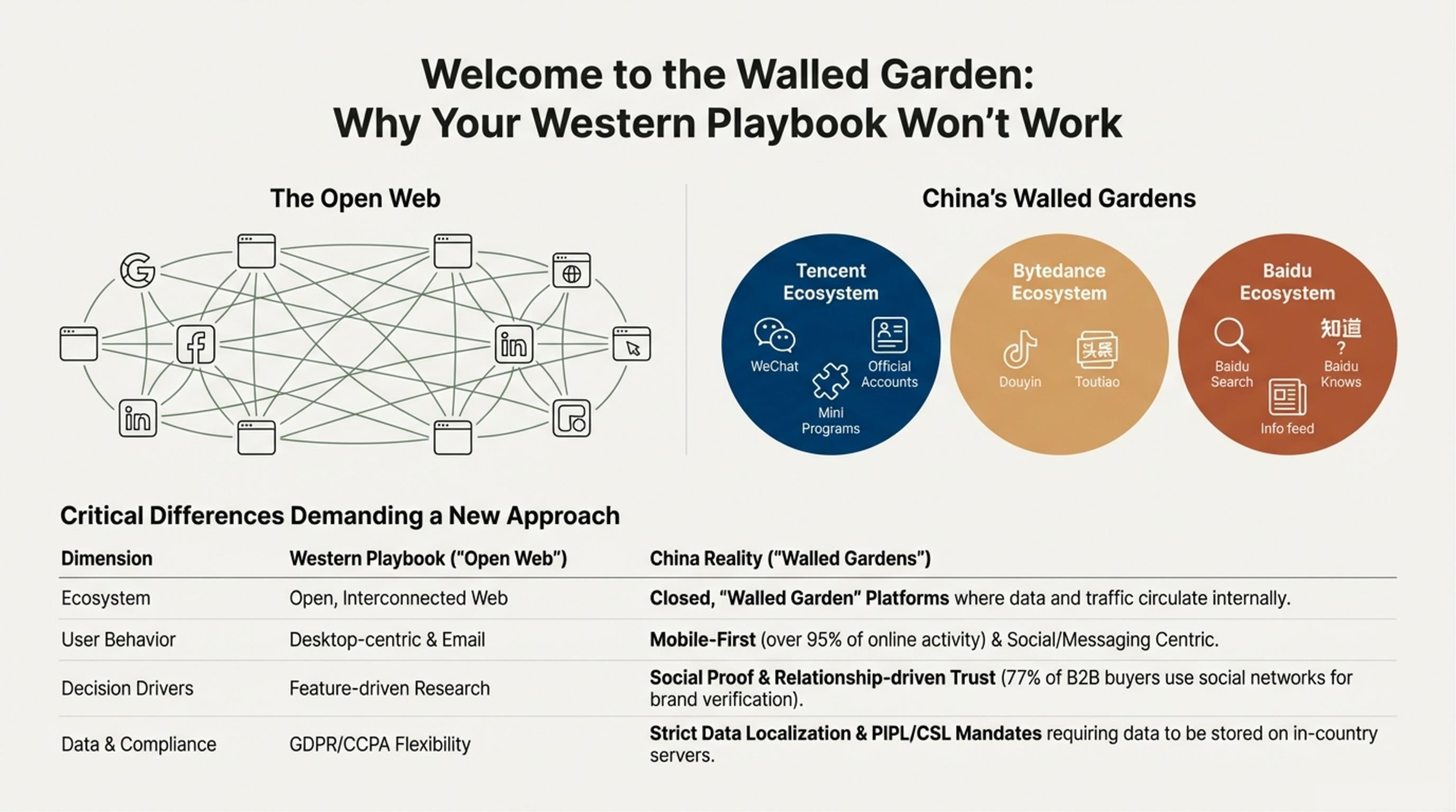 By 2026, over 95% of B2B digital activity in China occurs on mobile devices within these environments. The traditional standalone desktop website has been relegated to a secondary “trust certificate”—a digital business card procurement officers visit only to verify your existence. If your customers never leave WeChat, vertical industry portals, or AI-native search interfaces, a Western-centric “Open Web” strategy is more than a mistake; it is a strategic forfeiture of the world’s largest B2B market. For 2026, the question is no longer how to drive traffic to your site, but how to embed your presence where the decision-makers already live.
